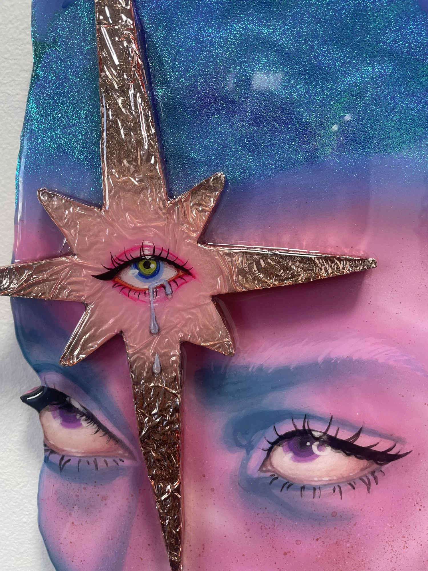 Hand-cut from birch wood, the Muddled Mind features holographic material that creates an iridescent and shifting backdrop. The textured 3D stars, crafted from repurposed metallic textiles, are